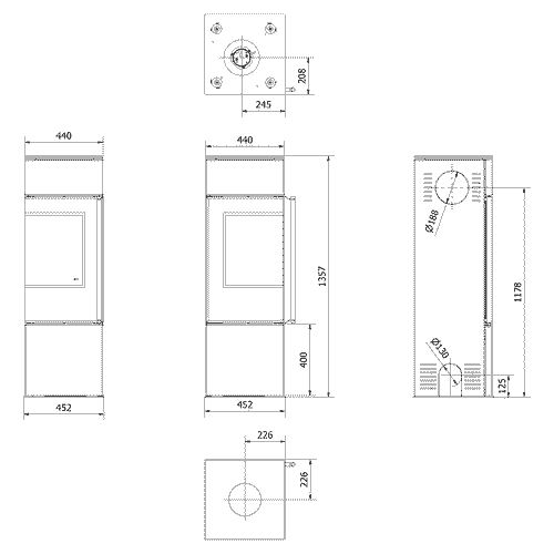 - Konstruksjon: Luftinntak, dekorativ glassdør, askeskuff, forbrenningskammer med innvendig fôr