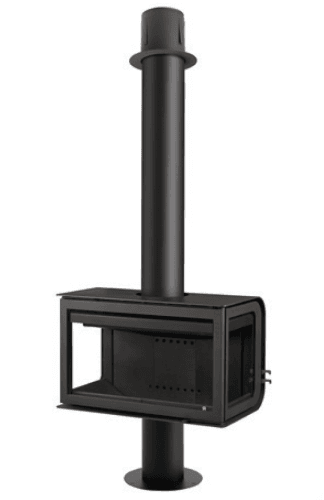 En moderne og stilren vedovn med sideglass, som gir maksimal innsikt til flammene fra flere vinkler. Perfekt som et visuelt midtpunkt i rommet – enten montert vegghengt eller pidestal