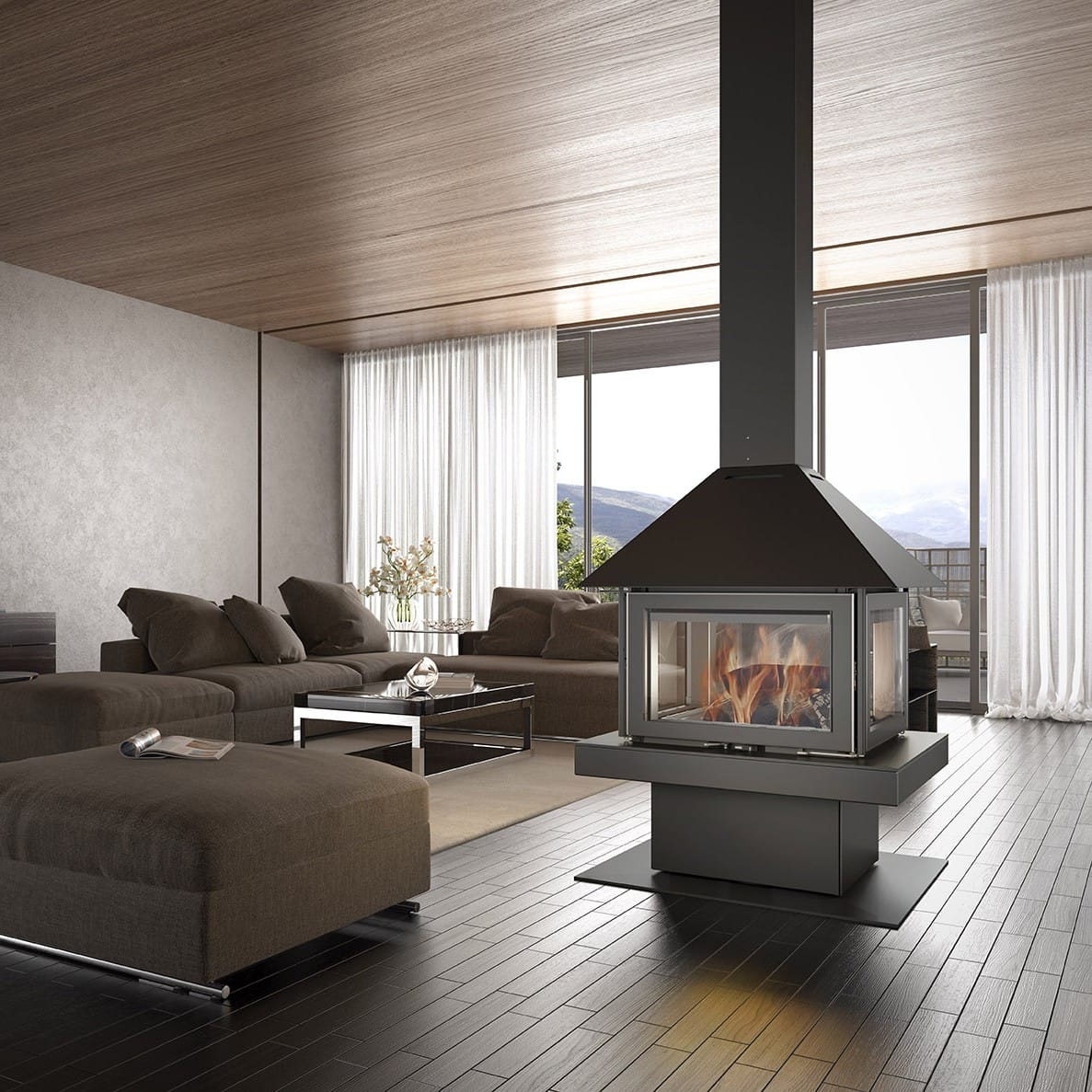 En eksklusiv, frittstående vedovn med glass på alle fire sider som gir 360° innsyn til flammene. Perfekt som rommets naturlige midtpunkt – enten i åpen stue, mellom soner eller i større oppholdsrom.
