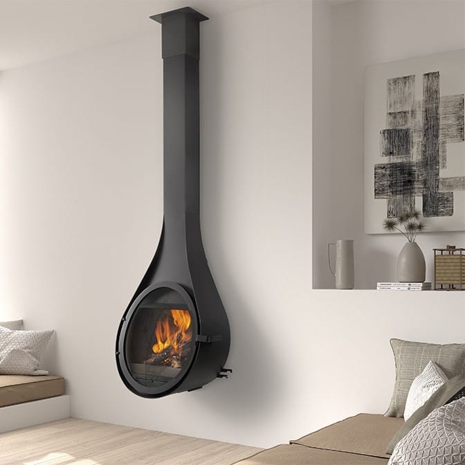 En stilren og vegghengt vedovn med en unik, avrundet silhuett som gir rommet et eksklusivt og lett uttrykk. Den dråpeformede kroppen kombinert med rund glassfront skaper et mykt, arkitektonisk blikkfang som passer perfekt i moderne hjem.