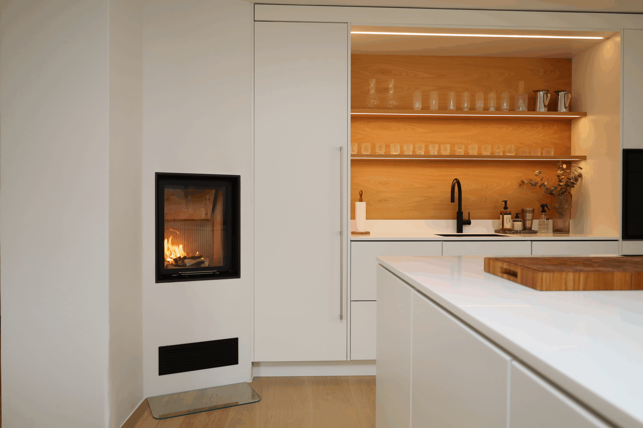 Kjøkkenpeiser blir stadig mer populære som både dekorativ og funksjonell detalj – de varmer opp rommet og gjør matlagingen ENDA koseligere.