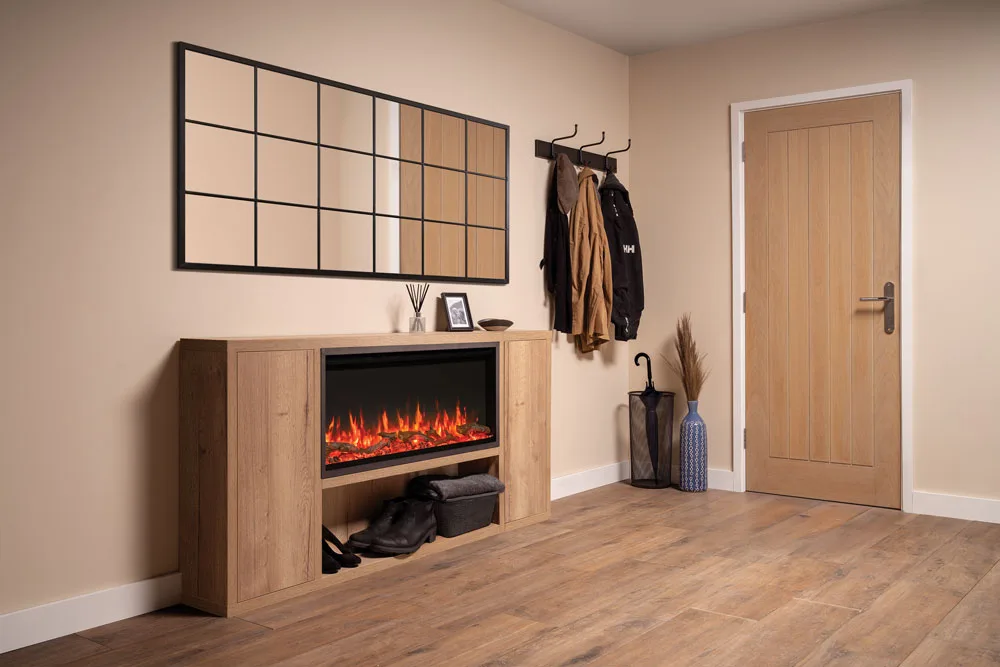 • Atmos 105R Venezia Suite kombinerer en stilfull eikefinish med et solid flat-vegg-design, som er ideelt for hjem uten skorstein. Med enkel og problemfri installasjon tilbyr Venezia Suite følgende: